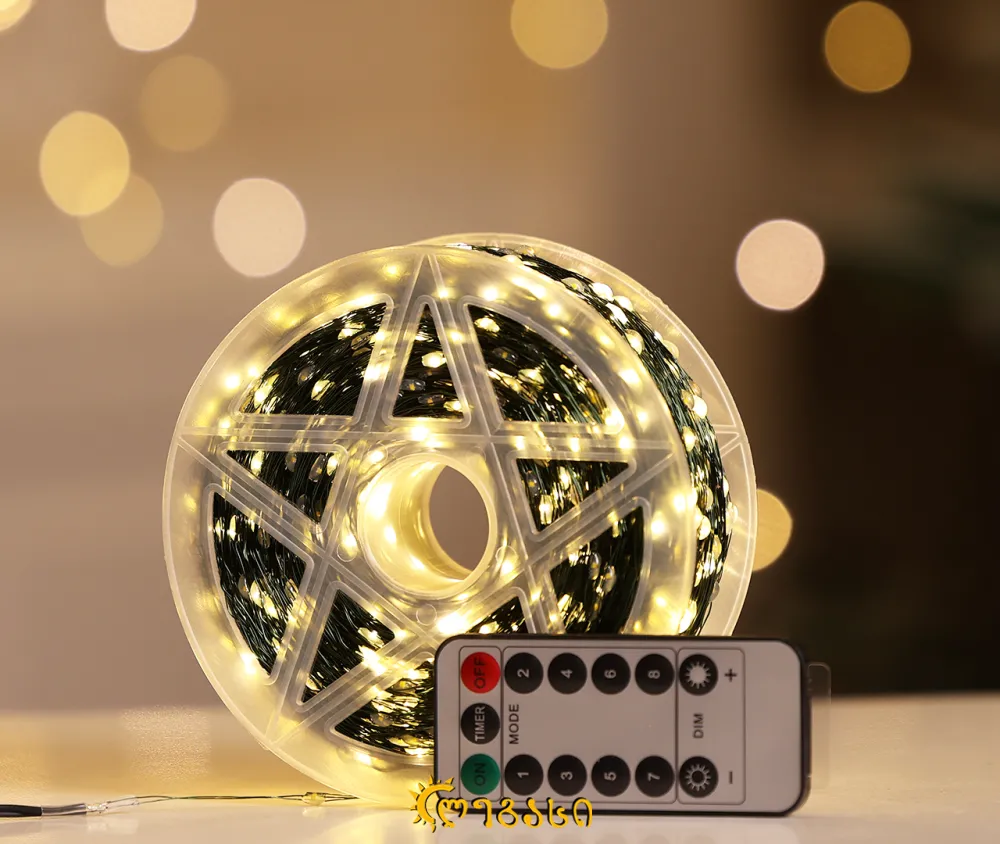 წერტილოვანი განათება თბილი ნათება 100 მეტრი (ნათების რეჟიმები დისტანციური მართვით)