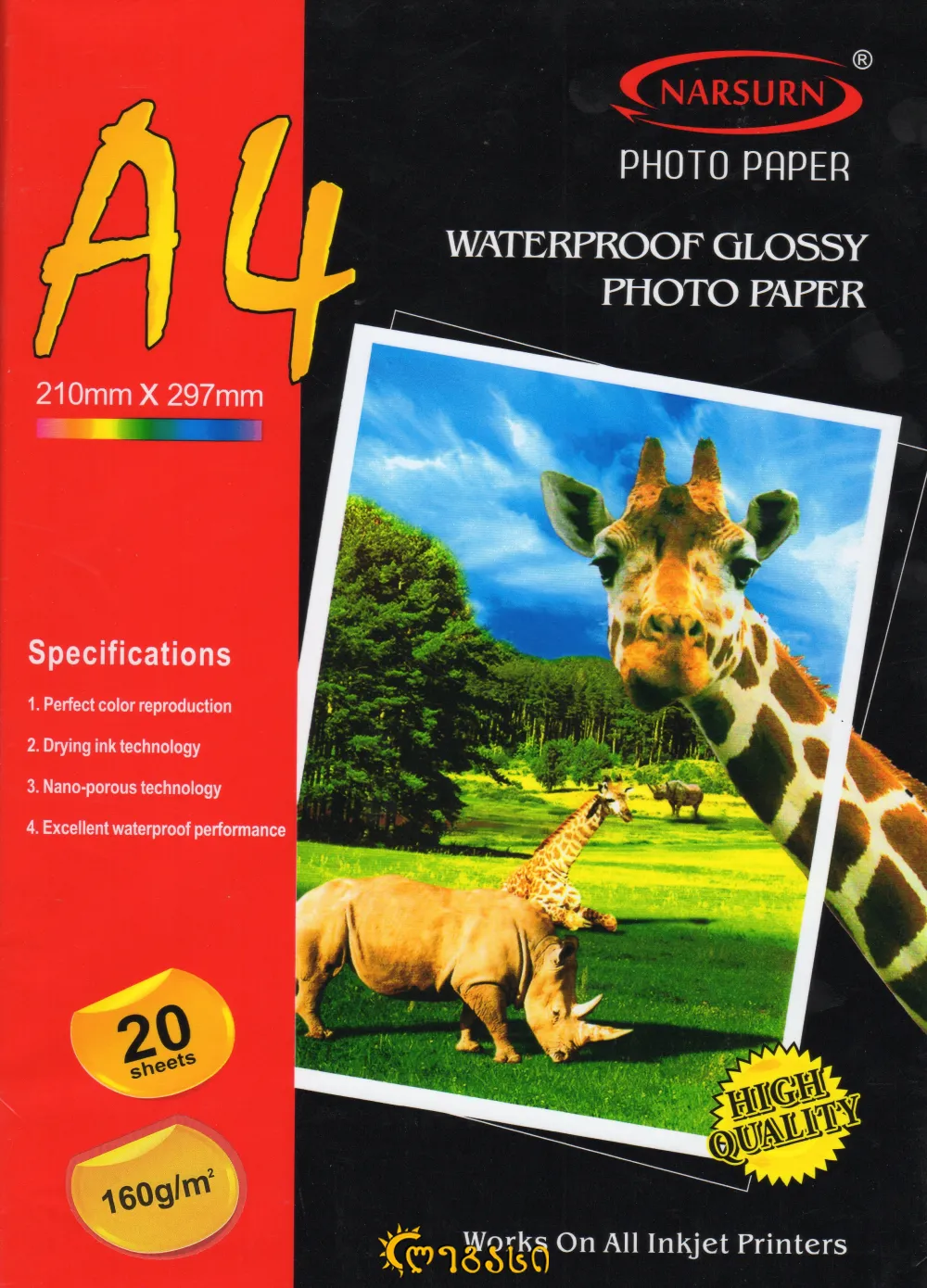 ფოტო ქაღალდი A-4 ერთმხრივი 20-ცალიანი WATERPROOF GLOSSY PHOTO PAPER 160 G/M