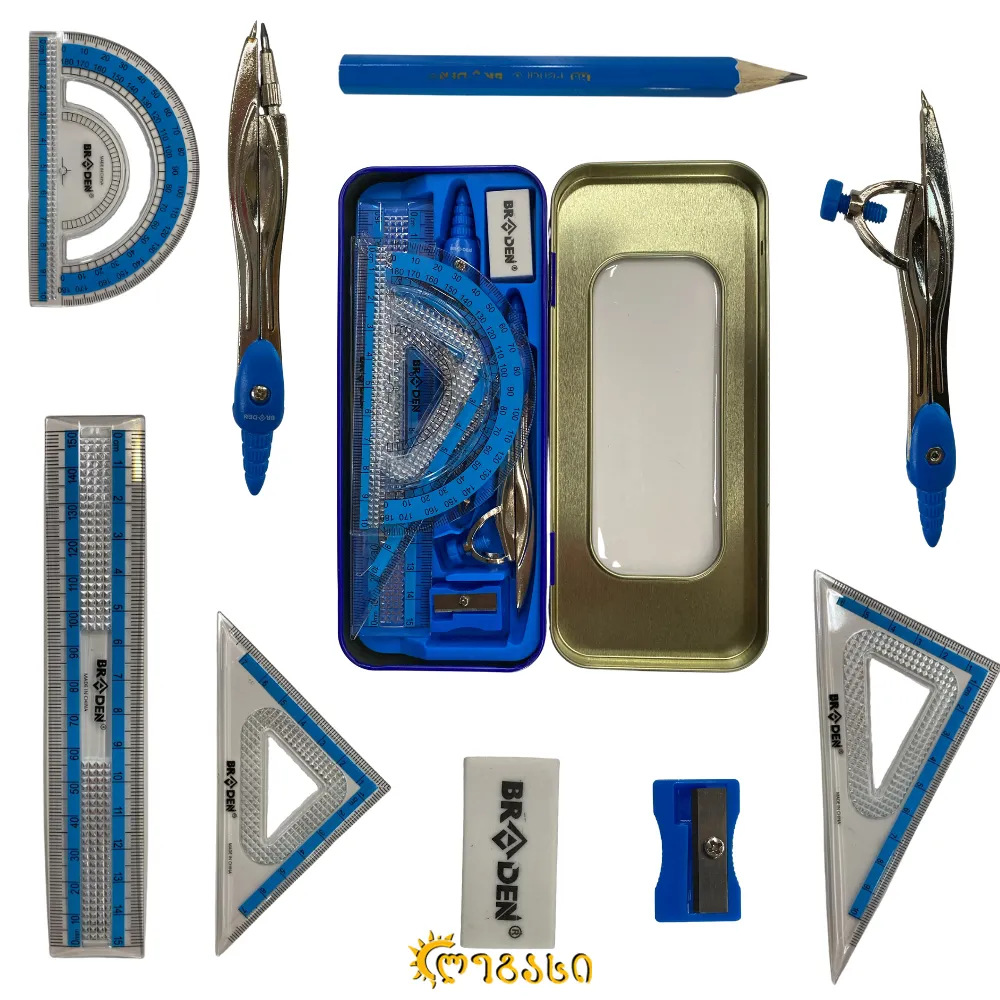 ნაკრები – 10 ნაწილი: ნაკრებში შედის: HB ფანქარი, საშლელი, კალმისტარი, 15 სმ-ის სახაზავი, ორი სამკუთხედი, ორი კუთხემზომი (პროტრაქტორი), კომპასი, გამყოფი (დივიდერი) და შაბლონი. იდეალურია სწავლისთვის, გეომეტრიული ამოცანების ამოხსნისა და ტექნიკური ხატვისთვის. მაღალი ხარისხის მასალები უზრუნველყოფს ზუსტ და კომფორტულ გამოყენებას.