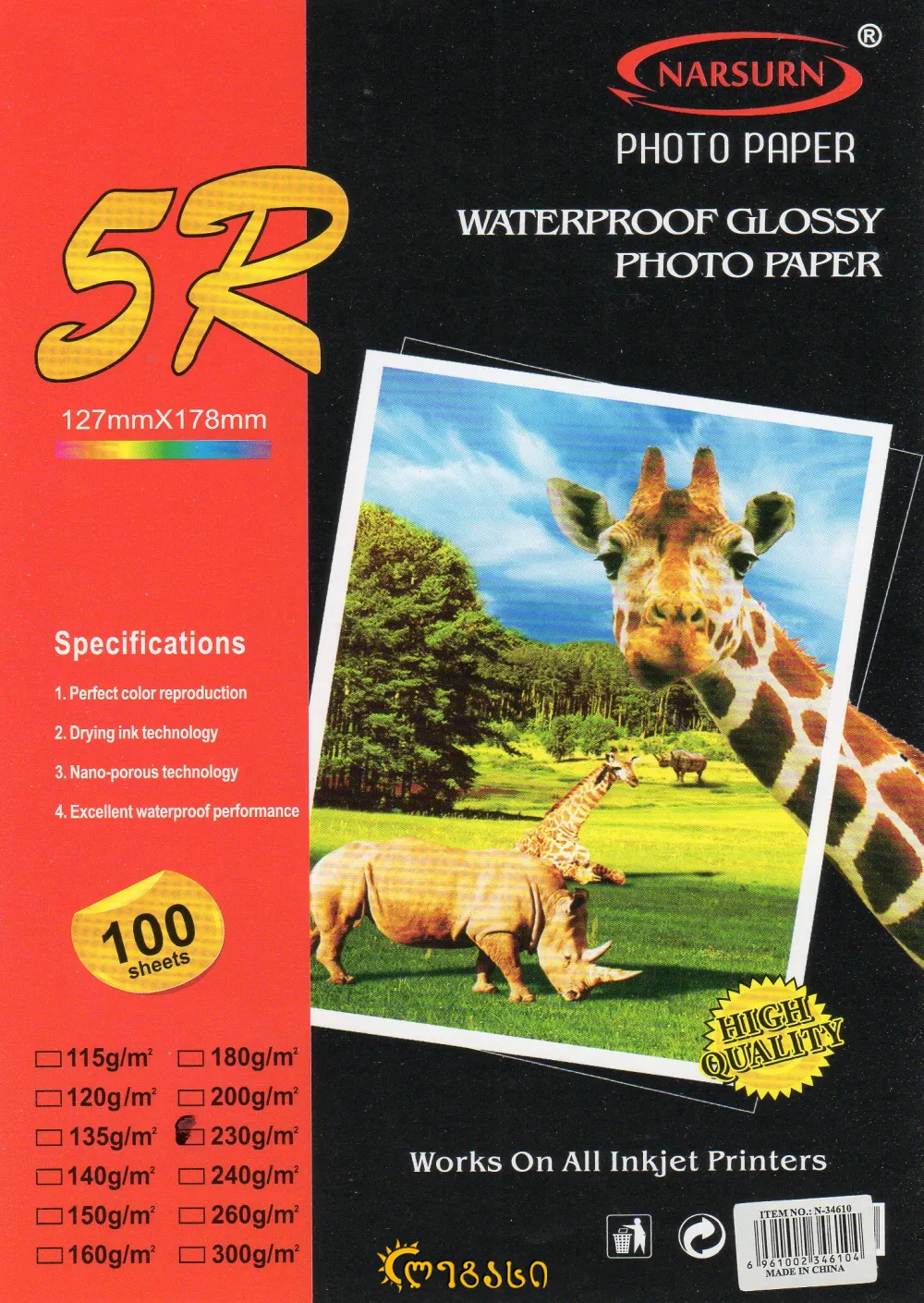 ფოტო ქაღალდი127x178მმ. 230-გრ 100-ცალიანი WATERPROOF GLOSSY PHOTO PAPER 230G/M