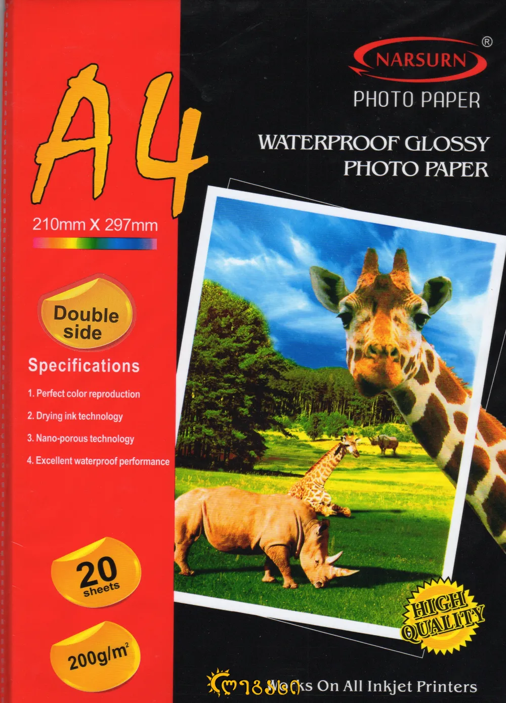 ფოტო ქაღალდი A-4 ორმხრივი 20-ცალიანი WATERPROOF GLOSSY PHOTO PAPER DOUBLE SIDE 200 G/M
