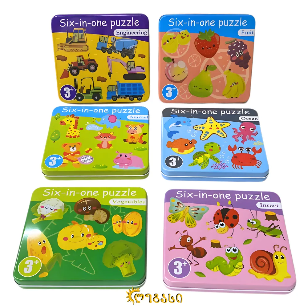 ხის ფაზლი - ექვსში ერთი პაზლი (ინჟინერია, ხილი, ცხოველები, ოკეანე, ბოსტნეული, მწერები)