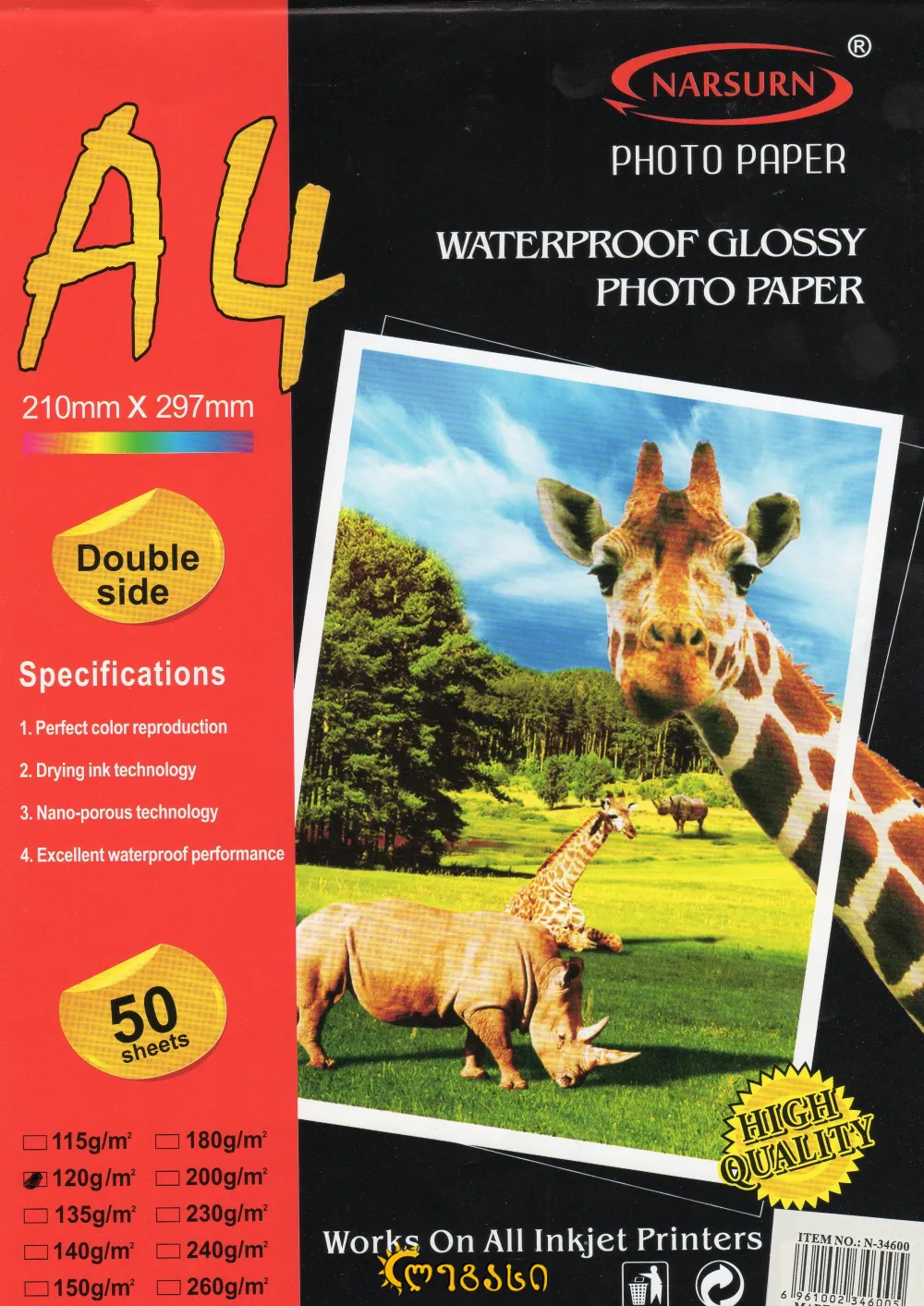 ფოტო ქაღალდი ა-4 ორმხრივი 50-ც. 120-გრ. WATERPROOF GLOSSY PHOTO PAPER DOUBLE SIDE 120 G/M