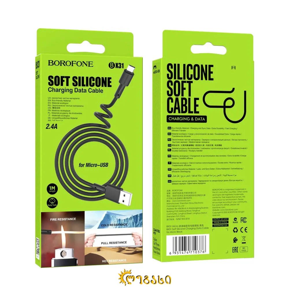 Borofone BX31 Soft Silicone არის გამძლე და მოქნილი USB-A – Micro-USB კაბელი, რომელიც განკუთვნილია როგორც დამუხტვისთვის, ისე მონაცემთა გადაცემისთვის. მისი სიგრძე 1 მეტრია და უზრუნველყოფს მაქსიმუმ 2.4A დენის გამტარობას, რაც იძლევა სწრაფ და სტაბილურ დამუხტვას.
