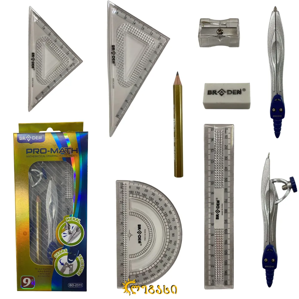 ნაკრებში შედის HB საწერ-ფანქარი, საშლელი, კალმისტარი, 15 სმ-ის საზომი სახაზავი, კომპასი, რიცხვების გამყოფი (დივიდერი), ორი სამკუთხედი, და პროტრაქტორი (კუთხემზომი). იდეალურია სკოლისა და საგამოცდო გამოყენებისთვის. ყველა ნივთი ზუსტი, ხარისხიანი და მოსახერხებელია მოსწავლეებისთვის.