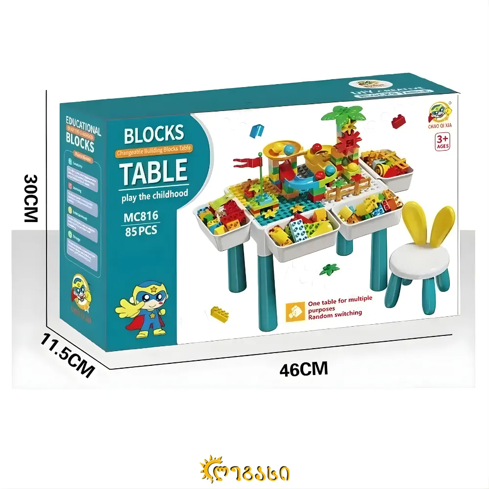 Block Table 220 Pcs არის ფერადი პლასტიკური ბლოკების ნაკრები ბავშვებისთვის, რომელიც აერთიანებს თამაშსა და სწავლას. ნაკრებში შედის 1 მაგიდა, 1 სკამი, 85 კონსტრუქციული ბლოკი და 4 სასაწყობი უჯრა. ბლოკები სხვადასხვა ფორმისა და ზომისაა, რაც ხელს უწყობს ბავშვის შემოქმედებითობას, ხელ-თვალის კოორდინაციას და ფერების აღქმას. მაგიდა უზრუნველყოფს კომფორტულ სათამაშო ზედაპირს, უჯრები კი ნივთების ორგანიზებას. შესაფერისია 6 წლიდან ზემოთ ბავშვებისთვის. დამზადებულია უსაფრთხო და გამძლე პლასტიკით.