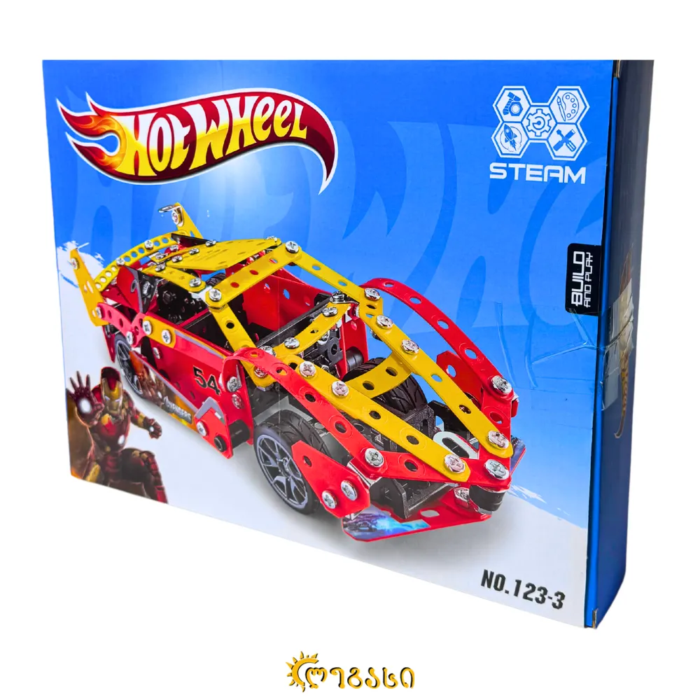 MARVEL-ის სუპერგმირის, რკინის კაცის თემატიკის, ასაწყობი სათამაშო მანქანა.