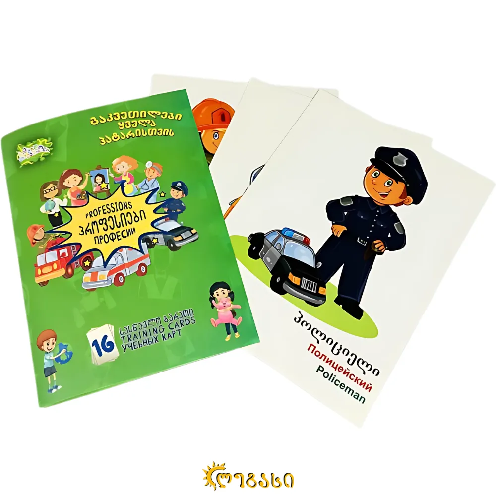პროფესიების სასწავლო ბარათები არის შემეცნებითი და სახალისო საშუალება, რომლის მეშვეობითაც ბავშვები გაიცნობენ სხვადასხვა პროფესიის წარმომადგენლებს. თითოეულ ბარათზე დატანილია პროფესიის სახელი და შესაბამისი ილუსტრაცია, რაც მათ აძლევს შესაძლებლობას მარტივად შეიგრძნონ, თუ რას აკეთებს კონკრეტული სფეროს სპეციალისტი.