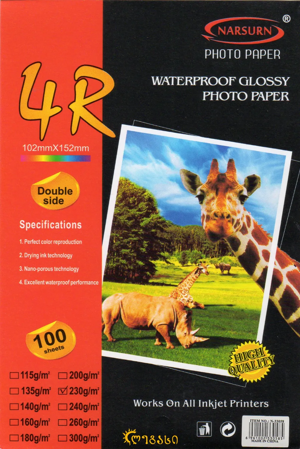 ფოტო ქაღალდი 10X15 ორმხრივი 230 გრ WATERPROOF GLOSSY PHOTO PAPER DOUBLE SIDE 230 G/M