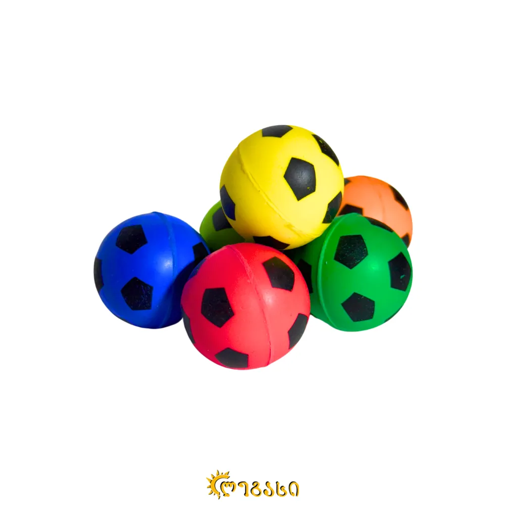 კაუჩუკის ფერადი ბურთები, ფეხბურთის ბურთის დიზაინით, ექვს სხვადასხვა ფერში.