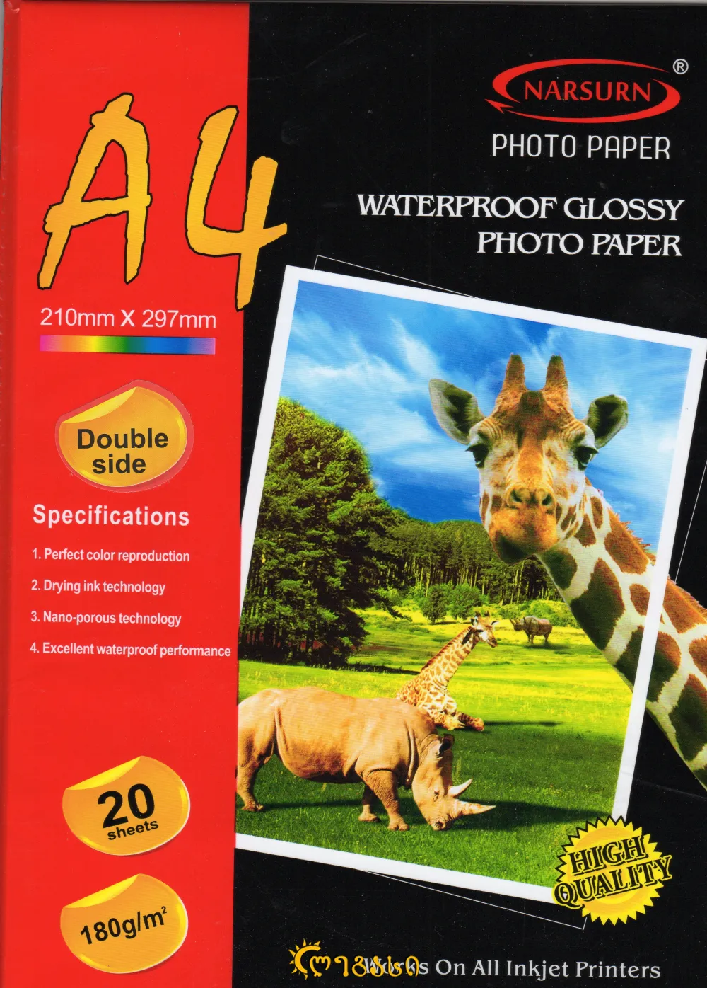 ფოტო ქაღალდი ა-4 ორმხრივი 20-ც. 180-გრ. WATERPROOF GLOSSY PHOTO PAPER 180G/M